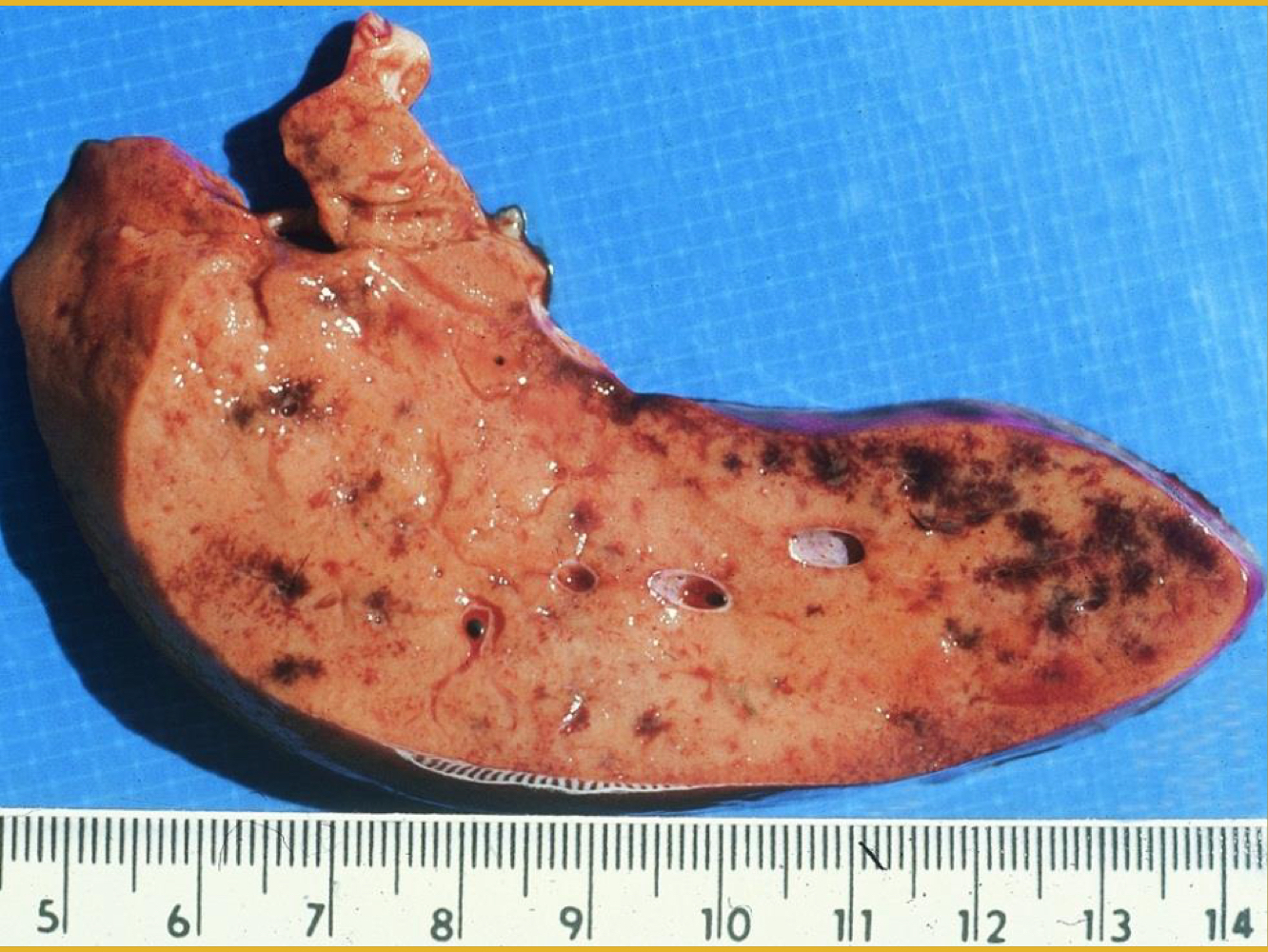 hepatic necrosis - enlarged, yellow, friable, petechial hemorrhage