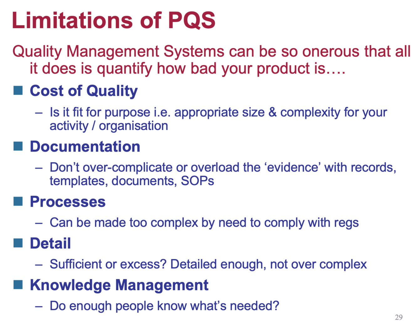 Knowledge Management –> Not enough people may understand the reasoning behind the PQS