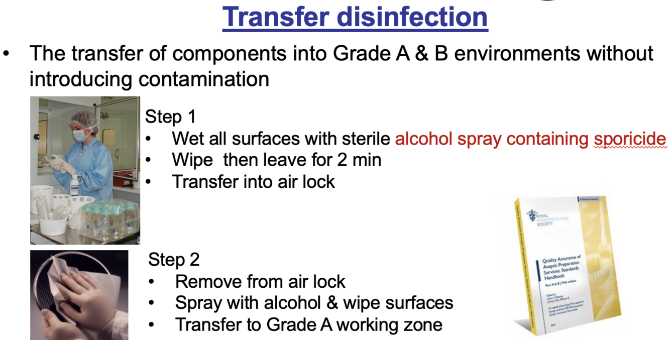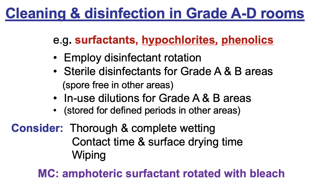Use in-use dilution disinfectants (must be used right away) in grade A/B areas
