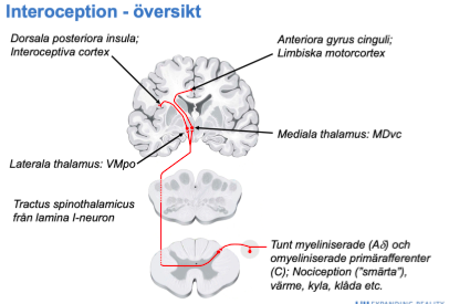 När det gäller interoceptionens bana så kommer vi framförallt att ha 2 olika primärafferenter; myeliniserade alfa-delta fiber och omyeliniserade C-fiber. Dessa primärafferenter kommer löpa in i dorsalhornet i ryggmärgen där de kopplar om (synaps). Härifrån kommer de sedan att korsa över till andra sidan ryggmärgen och bilda tractus spinothalamicus och denna kommer att löpa upp hela vägen till thalamus. Väl i thalamus kommer den att koppla om på 2 olika kärnor, en i laterala thalamus (VMpo) och en i mediala thalamus (MDvc).