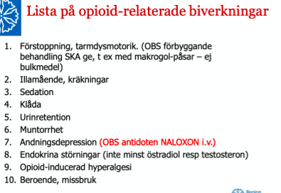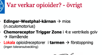 Vi har receptorer för endogena opioider i tarmen. När dessa stimuleras får vi minskad tarmmotilitet → förstoppning