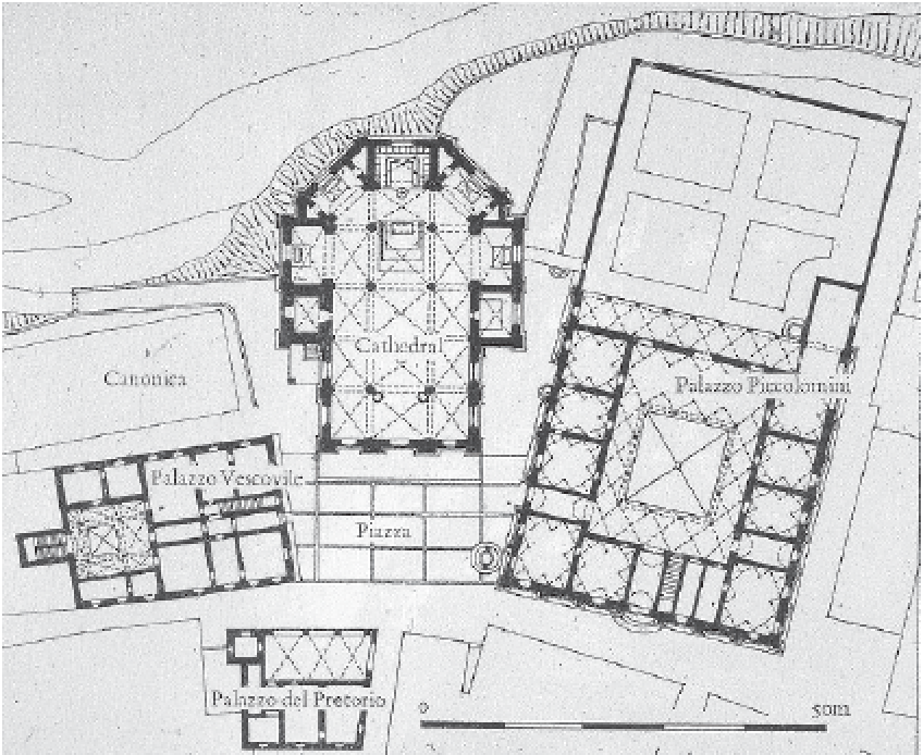 Rebuilt by Bernardo Rossollino for Pope Pius (Piccolomini) using model of Ideal City and proportions. Grid carefully calculated.
