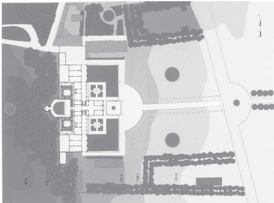 Villa Urbana; Walled garden on the OtraArno. Horses Procession (reversal of movement) splitting + rejoining and comming down a hill - Garden designed to acomodate formal ceremonies + cavalcade of horses