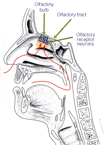 red = route that molecules take to reach olfactory epithelium