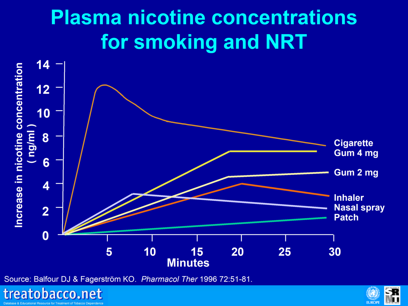 -Nicotine dose from NRT is lower and administered more gradually than with smoking and this reduces the addictive potential