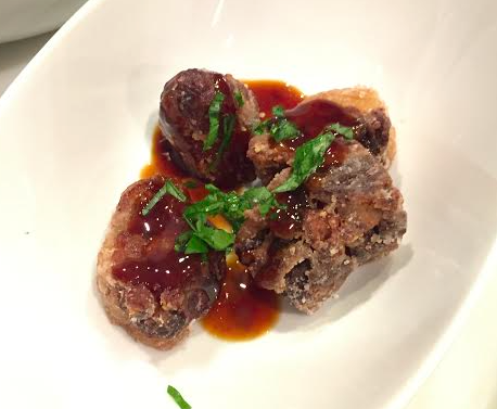 Pig tails braised in soy sauce, garlic, fermented black bean, and ginger. Dusted in potato starch and deep fried. Tossed in the reduced braising liquid. Topped w. gremolata (cilantro, lemon zest and garlic), finished w. lemon juice.