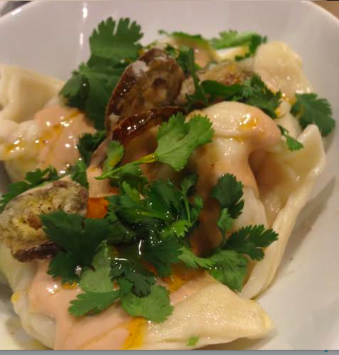 Pork wontons (pork, ginger, scallion, sesame oil). Topped w. fried jalapenos and smoked tahini (soy sauce, black vinegar, ground chinese peppercorn, and garlic).