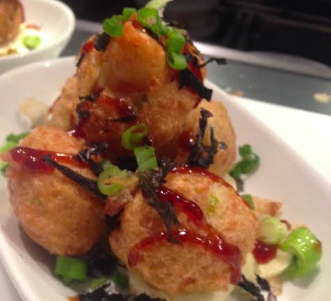 (House version Takoyaki). Local calamari that is braised until tender and folded into a pate choux (french cream puff batter). Served w. mayo with miso and sesame oil. Topped w. scallion, nori and bonito (smoked and dehydrated skipjack tuna).