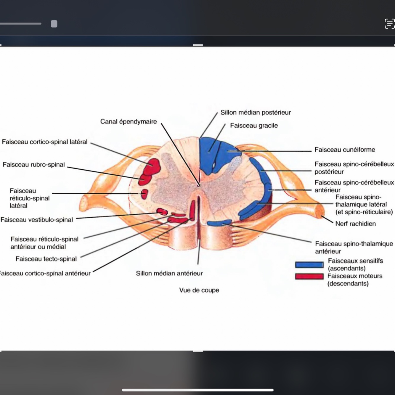 Ascendant = nerfs sensitifs, amènent l’info au cerveau