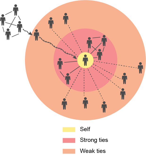 A social network is a social structure made up of a set of actors (individuals, friends, colleagues, etc.), sets of dyadic/triadic ties, and other social interactions between them. Here, the self is at the center.