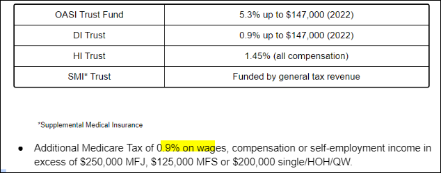 Ex: Crystal, a single filer, has $130,000 in wages and $145,000 in self-employment income.Crystal’s wages are not in excess of the $200,000 threshold for single filers, so Crystal is not liable for Additional Medicare Tax on these wages.