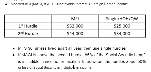 If a taxpayer’s MAGI plus one-half of the Social Security benefits received during the year does not exceed the base amount below, none of the Social Security benefits are includible in gross income.