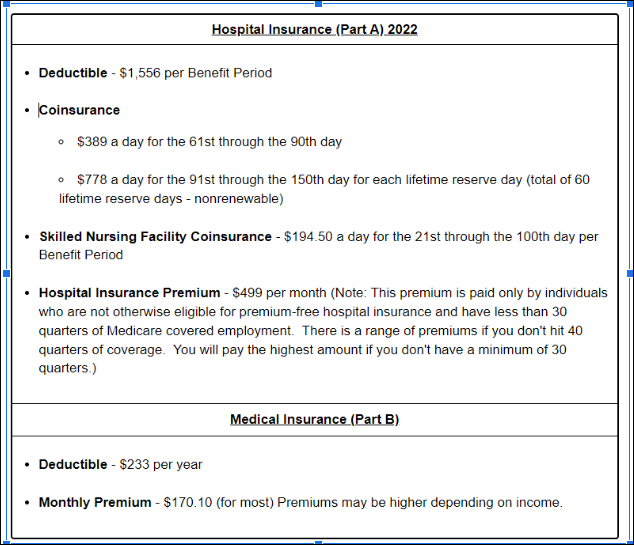 Cheat for remembering the costs. Divide the deductible by 2. That is your big number for per day for nights 91-150. Divided by 2 again. That is your smaller numebr for days 61-90. Divide by 2 again for skilled nursing (AKA nursing home( days. ($194/day).