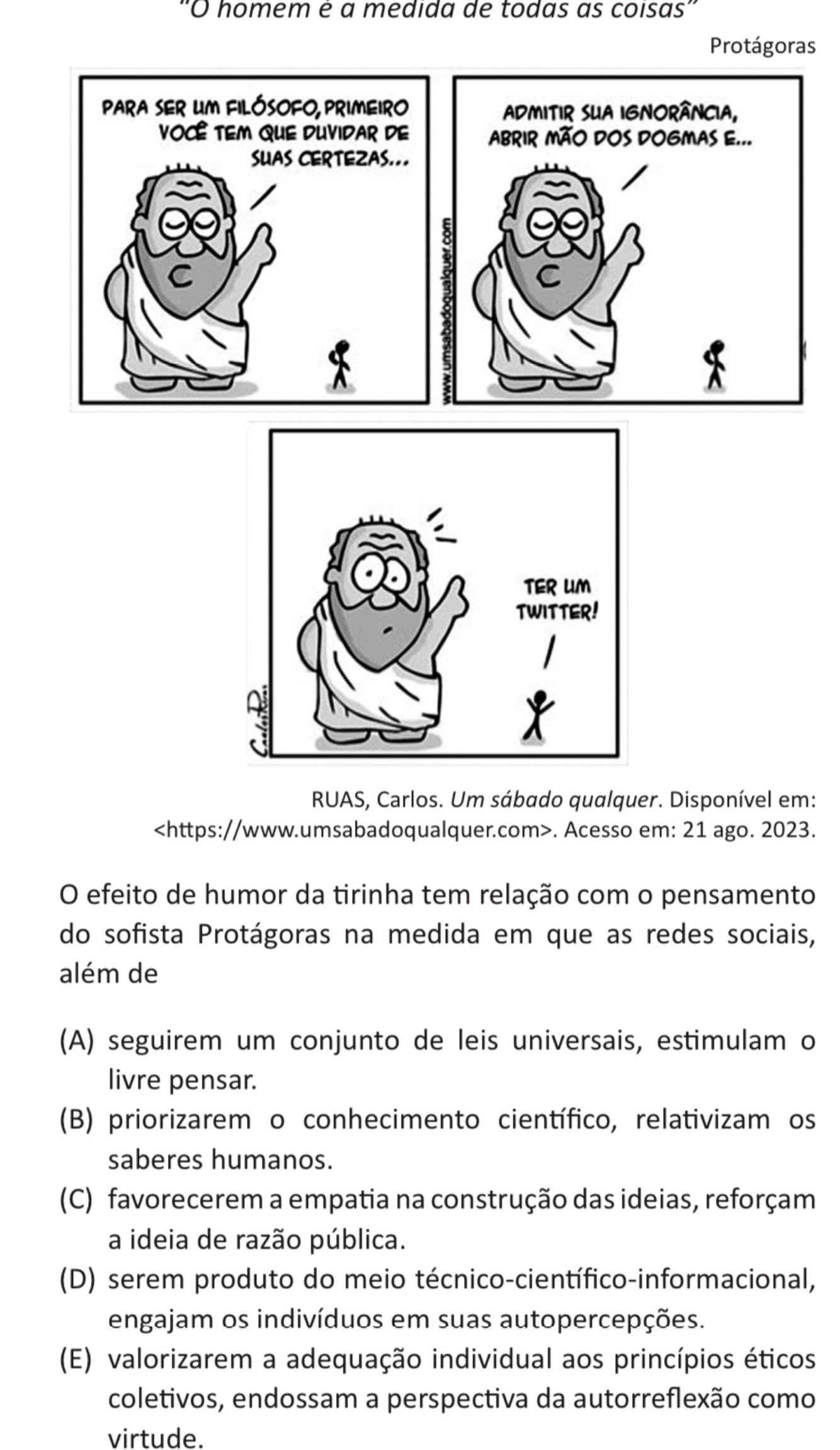 Obs: Protágoras era um filósofo grego sofista, desta forma, acreditava na relatividade dos valores, de modo que segundo ele não existia uma verdade absoluta, sendo necessário “duvidar de suas certezas”, pois nada é absoluto. Desta forma, as redes sociais são exemplo dessa relatividade, pois cada indivíduo toma o seu próprio ponto de vista como parâmetro para analisar a realidade, ou seja, são guiados por suas autopercepções.