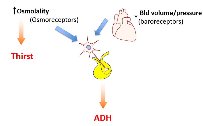 Blood volume/pressure (mediated by baroreceptors in carotids, atria, aorta) – BP drop detected by baroreceptors = more ADH release = more water resorption