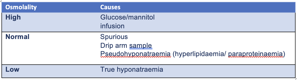 Causes of hyponatraemia by osmolality