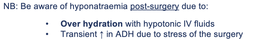 What electrolyte abnormality can occur post-surgery and why?