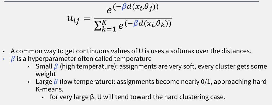 Large β (low temperature), approaching hard k-means, assignments become nearly 0/1