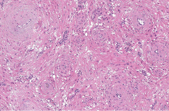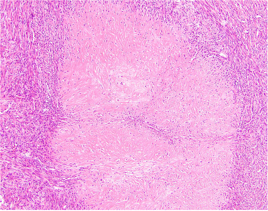 Low to moderately cellular, bland fusiform or spindled cells with focal to diffuse whirling in heavily collagenized stroma with abrupt transition to myxoid areas