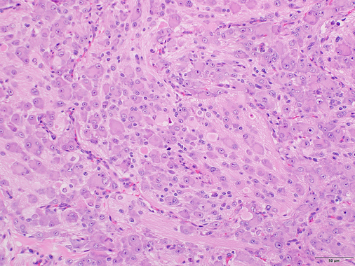 Below: Tumour cells typically display scant to moderate amounts of indistinct, palely eosinophilic cytoplasm and bland nuclei with fine pale chromatin and inconspicuous nucleoli.