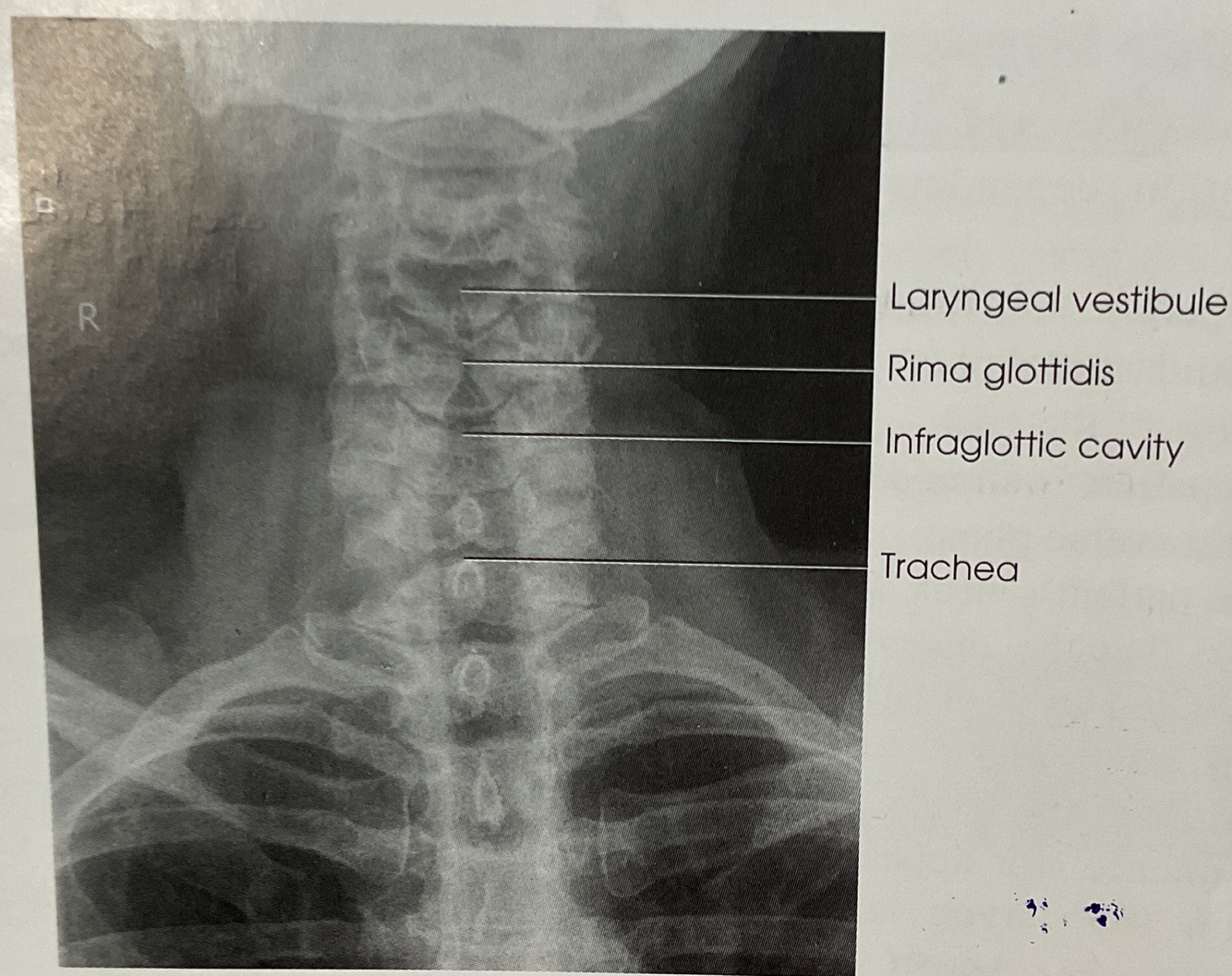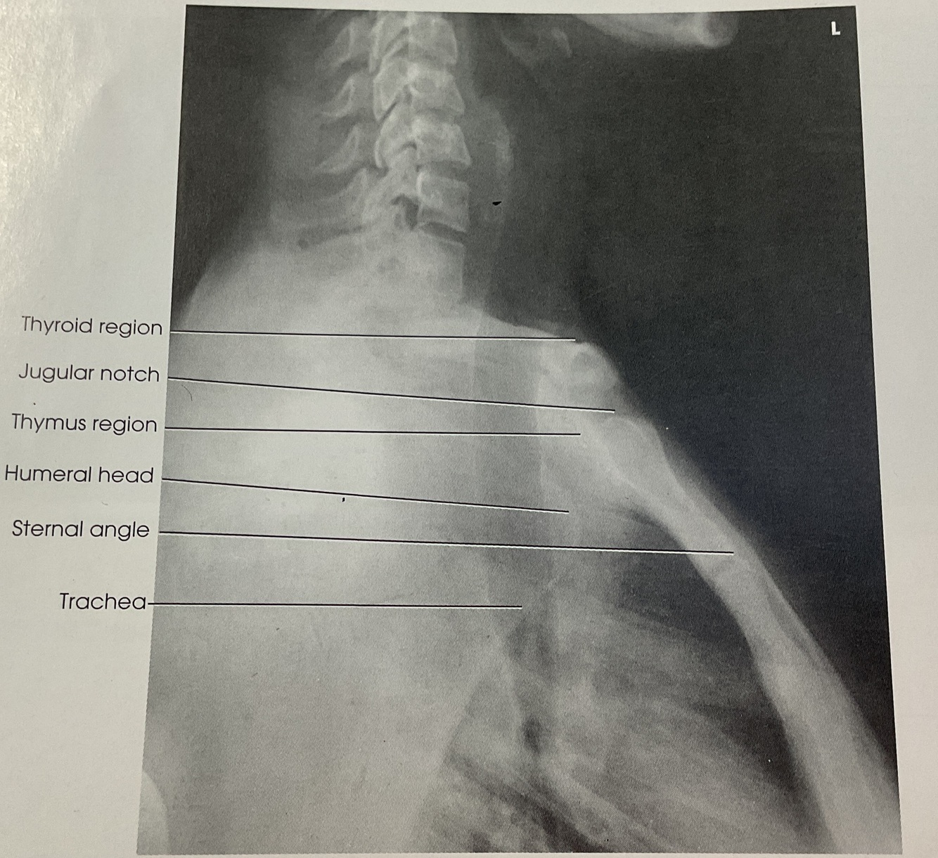 ~ AIr filled airway from midcervical to midthoracic region (TRACHEA & SUPERIOR MEDIASTINUM)