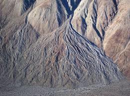 alluvial fan: triangle-shaped deposit of gravel, sand, and even smaller pieces of sediment, such as silt. This sediment is called alluvium. Alluvial fans are usually created as flowing water interacts with mountains, hills, or the steep walls of canyons