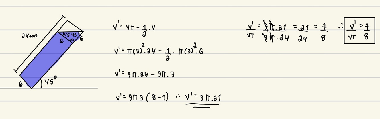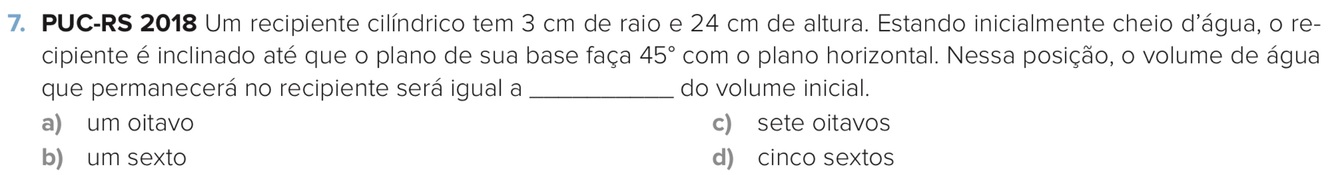 Nesse exercício iremos considerar que o volume derramado é metade do volume do cilindro menor com 6 cm de altura e raio da base igual a 3 cm.