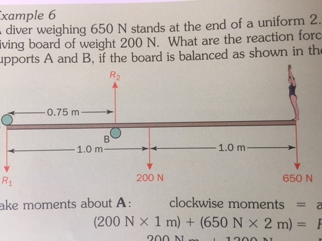 • (200N x 1m) + (650N x 2m) = R2 x 0.75m
