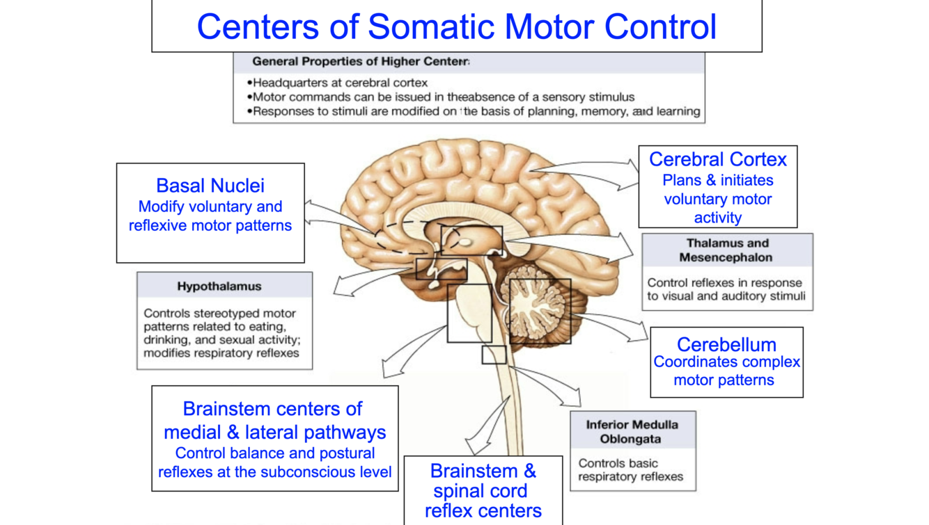 * Motor aera of cerebral cortex, basal nuclei, cerebellum, brainstem centers, and spinal cord