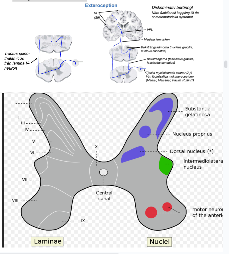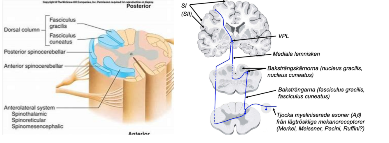- Leder signaler från olika lågtröskliga mekanoreceptorer och det leds in via dorsalrötterna och sen in till ryggmärgen. Den viktigaste delen kommer leda upp via det vi kallas baksträngarna, det område som ligger mellan bakhornet på respektive sida och där finns fasciculus gracilis- mer medialt