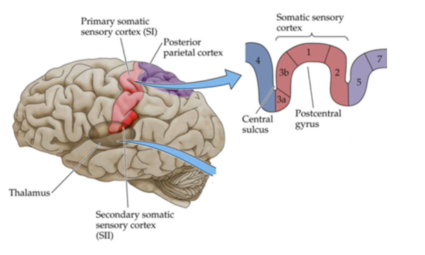 - Tar man ett snitt genom gyrus postcentralis där primära somatosensoriska cortex SI ligger kan man se till höger i bilden se att man kan urskilja att det inte är en strimma utefter gyrus postcentralis utan det är 4 olika strimmor- cortexområden: framifrån och bak har man först area 3a, sedan kommer area 3b, sedan area 1 och sedan area 2. 4 streck genom gyrus postcentralis som är olika cortexområden som räknas som primära somatosensoriska cortex