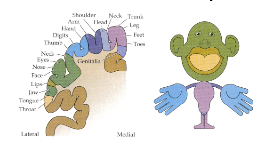 Generellt sett: det med störst representation det är handen och fingrarna, ffa tummen, även ansikte och läppar med stor representation i hjärnbarken- där finns den viktigaste detaljerade känseln.Områden som rygg, baksida vader, tunt med fibrer⇒ liten representation