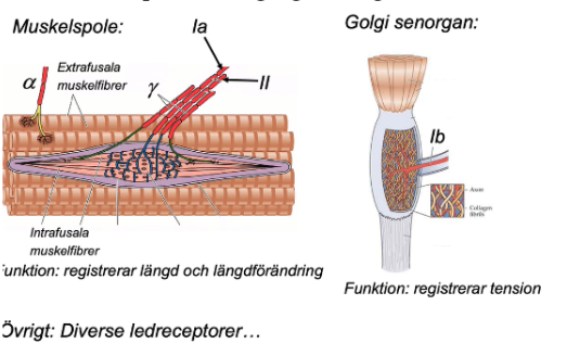 - viktigaste receptorerna är inkluderade i bilden: muskelspolar vars funktion registrerar längd och längdändring på muskler