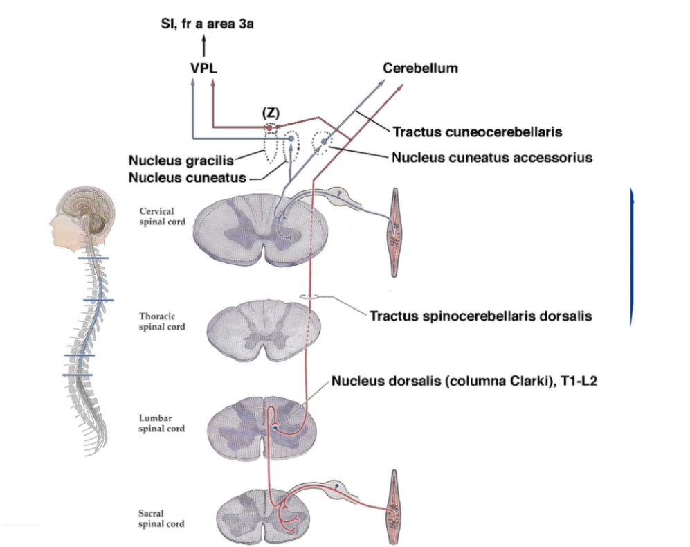 Liknar väldigt mycket hur beröringssinnet också leds vidare dvs baksträngskärnorna n. gracilis och cuneatus. I mitten på bilden= afferent tex från muskelspole som löper in via dorsalroten in i ryggmärgen, kommer i detta fall från armen där kommer axoner fortsätta upp till nucleus cuneatus i verkligheten särskilda delar av nucleus cuneatus där de kopplas om till nästa nervcell som sedan korsar över till andra sidan och axonen löper upp och terminerar i VPL vidare upp till S1, ffa area 3a.
