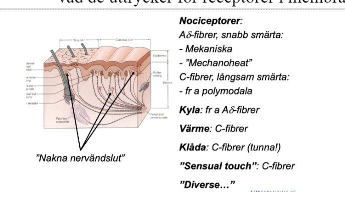- C-fibrer: långsamma smärtan, polymodala aktiveras av flera olika typer av smärtsamma stimuli ex hög eller låg temp, kemiska ämnen, mekanisk smärtsam stimuler