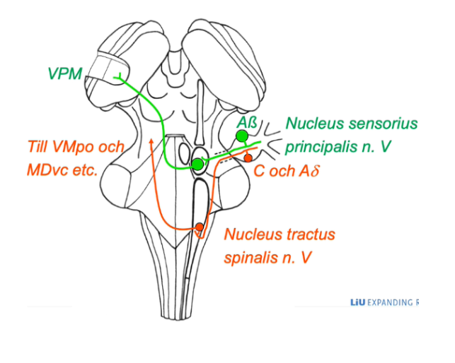 Olika sensoriska celler (meissner, merkel, pacini och rufini) kopplar till sensoriska nervfibrer (Aβ) från trigeminus som löper in hjärnstammen men samlar sina cellkroppar i trigeminusgangliet på vägen dit. I hjärnstammen terminerar de i nucleus sensorius principalis n. v. (motsvarar baksträngskärnorna fast för trigeminus systemet (ansiktets känsel)). De nya cellkropparna skickar ut sina axoner så de korsar hjärnstammen och åker upp till VPM istället för VPL, (och sedan upp mot (gyrus postcentralis antar jag)).