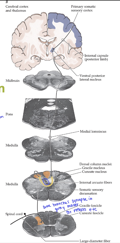 travels through posterior limb of internal capsule to post central gyrus
