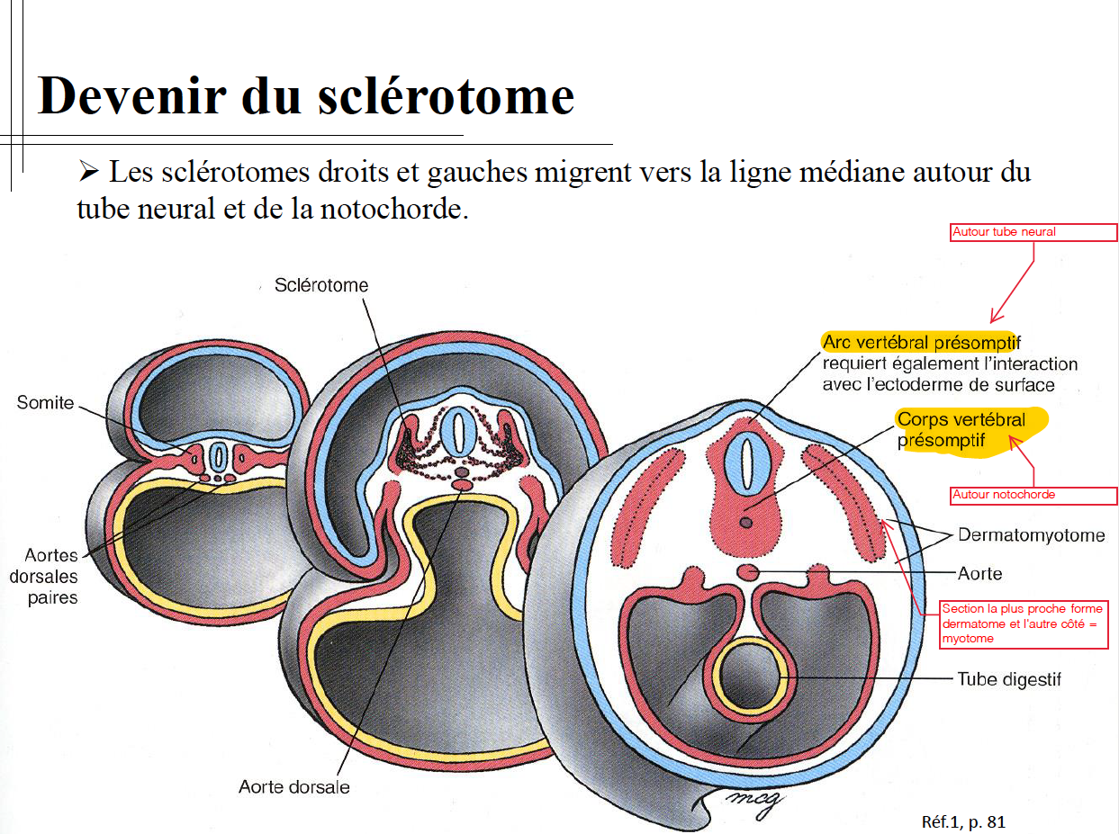 Lorsque les sclérotomes se fendent et continuent, il y a quelques cellules qui vont rester (abandonnées sur place) et vont permettre la formation du disque intervertébral.