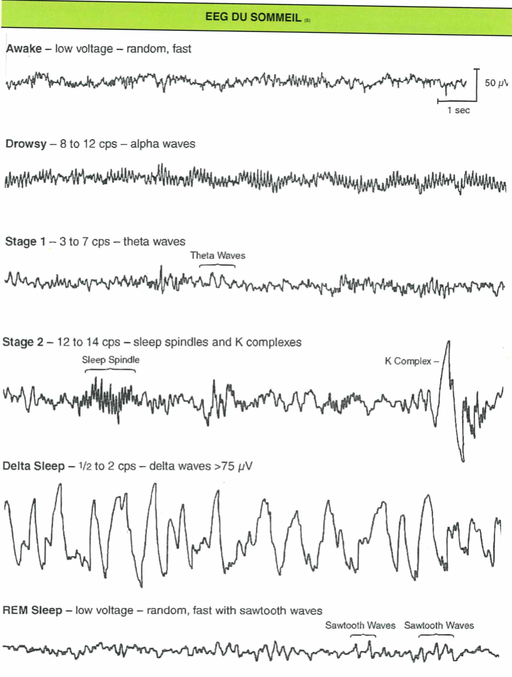 Décrivez les stades d’endormissement et les rythmes d’EEG associés