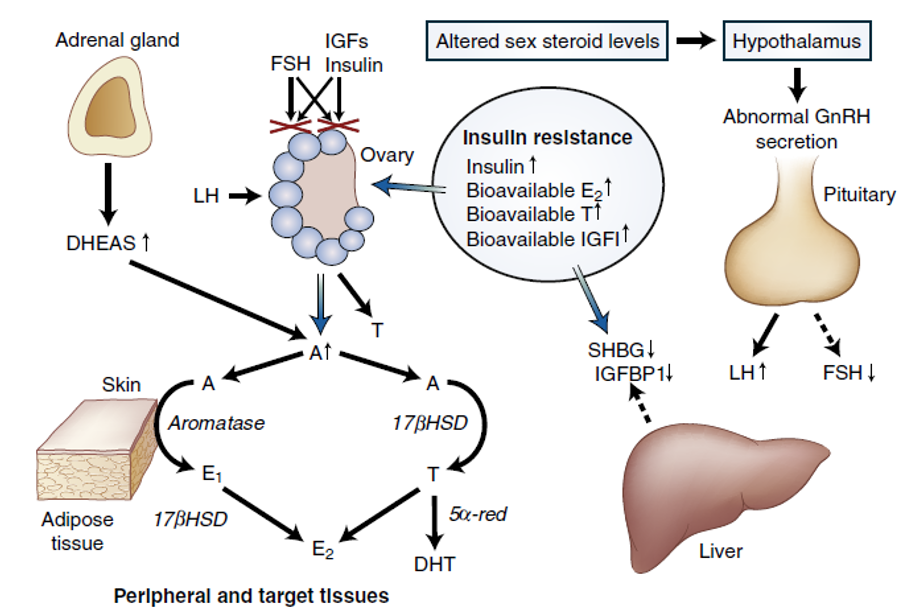 LA ANDROSTENEDIONA QUE SE LIBERA EN OVARIO SE CONVIERTE EN TESTOSTERONA POR 17-B Y PASA A FORMA ACTIVA QUE ES DHT O TAMBIEN SE PUEDE CONVERTIR A ESTRADIOL POR MEDIO DE LA AROMATASA