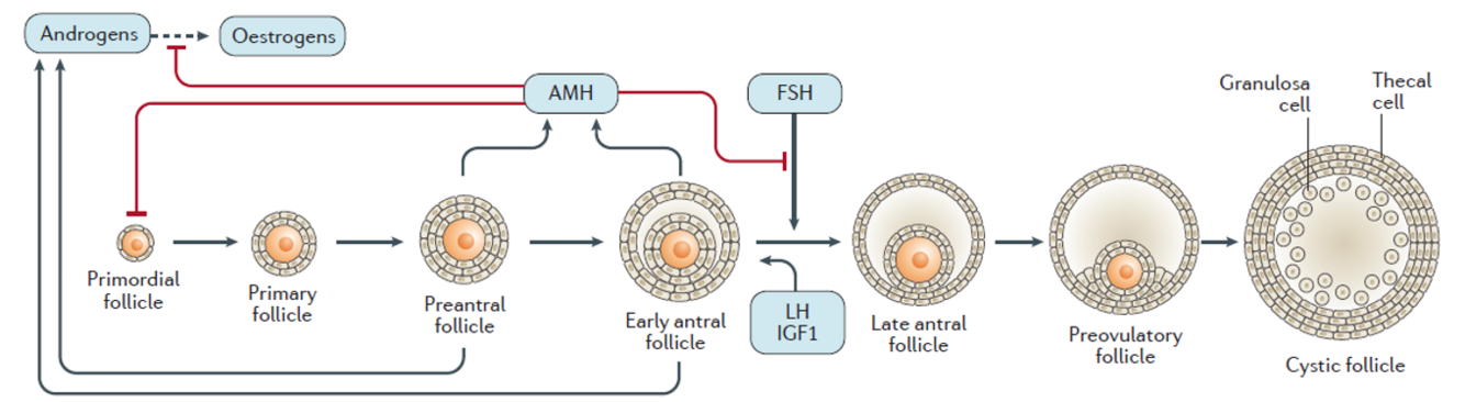 FOL PRIMORDIAL DEBE DE MADURAR HASTA SER OVULATORIO PERO SE QUEDA EN FASE ANTRAL TEMPRANA: LIBERA HORMONA ANTIMULERIANA QUE ADEMÁS INHIBE CRECIMIENTO ENTONCES MISMOS FOLICULOS INHIBEN SU PROPIA MADURACIÓN