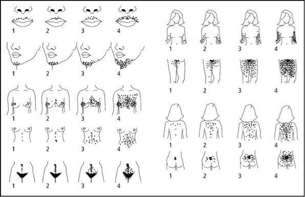 Hirsutismo: presente en 65-75%, valorado mediante escala de Ferriman Gallwey (para mujeres en MX son 8 pts para decir que hay hirsutismo)