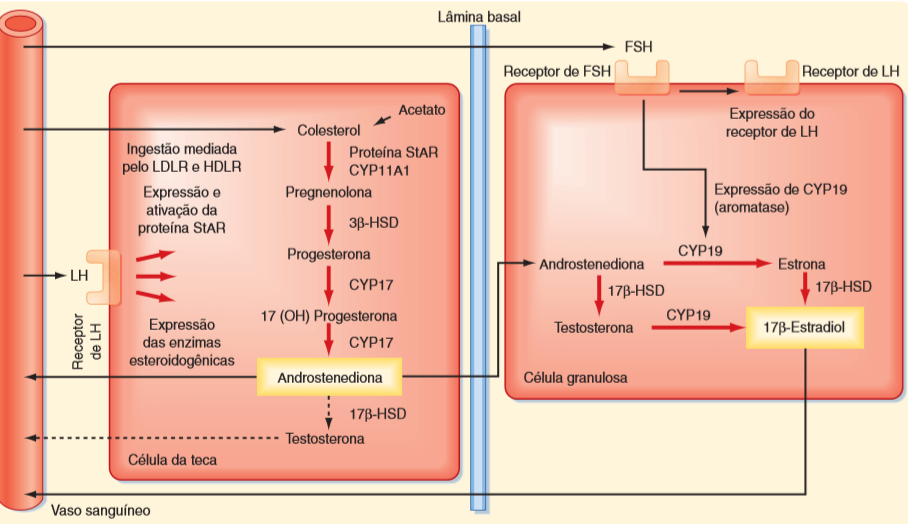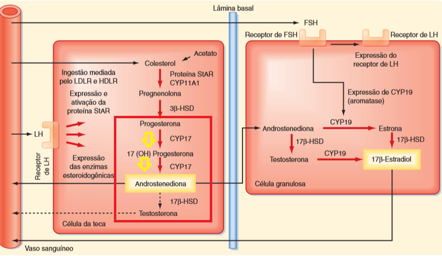 Desregulação da CYP17 com maior produção de androstenediona e testosterona na célula da teca.