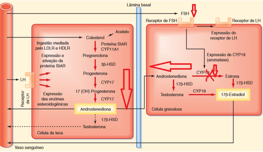 Quais as causas que levam ao feedback negativo no FSH e consequente menor produção de estrogênio e maior de androgenios formando um ciclo?(3)
