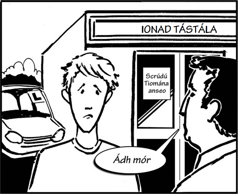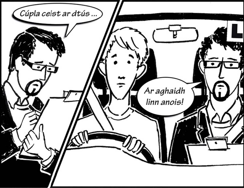 Thóg an scrúdaitheoir Seán ar ais go dtí an ionad tástála. Shuí siad in oifig an scrúdaitheora (the examiner’s office). Bhí an t-ádh dearg ar Sheán. Thug an scrúdaitheoir seans eile (another chance) dó. Dúirt sé leis cleachtadh (practice) a dhéanamh agus níos mó aire a thabhairt ar na bóithre (show more caution on the roads).