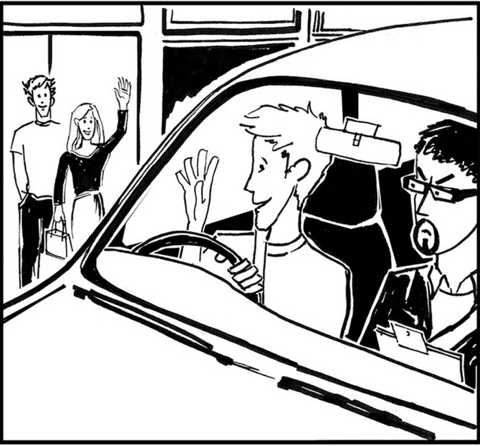 Chonaic Seán a chairde agus é ag tiomáint síos an bhóthar. Thug sé beannacht dóibh (he greeted them). Ní raibh cuma sásta ar an scrúdaitheoir. Ní raibh súile Sheáin ar an mbóthar.