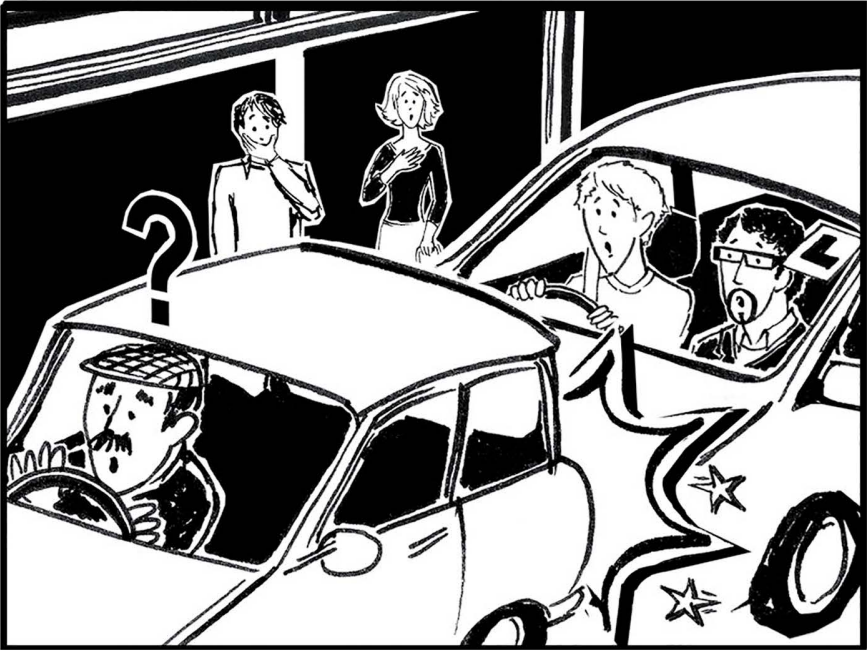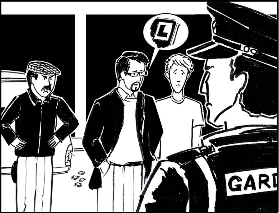 D’éirigh gach duine amach as na carranna. Tháinig garda agus chuir sé ceisteanna ar gach duine faoin timpiste. Bhí cúlsolas an fear eile briste ag Seán. Bhí an fear feargach (the man was angry). Mhínigh an scrúdaitheoir gur foghlaimeoir (learner) é Seán agus gur timpiste a bhí ann.