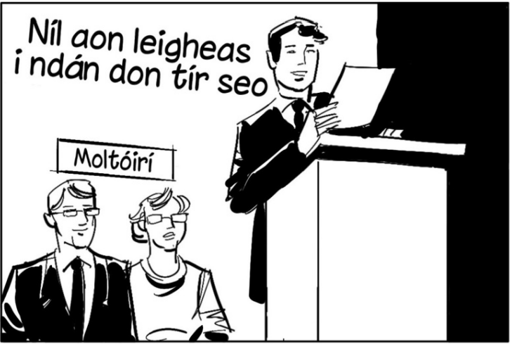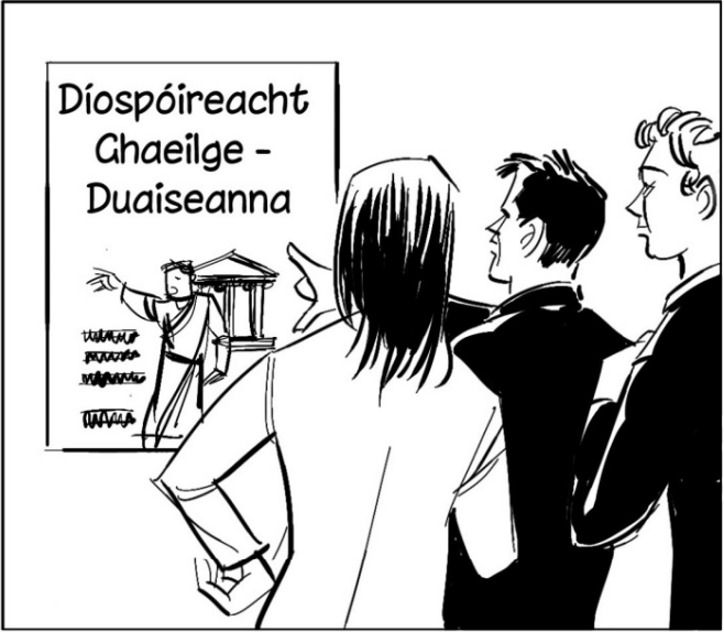 Chonaic Áine, Jack agus Seán fógra sa scoil ag lorg daoine don fhoireann díospóireachta Gaeilge (Irish debating team).
