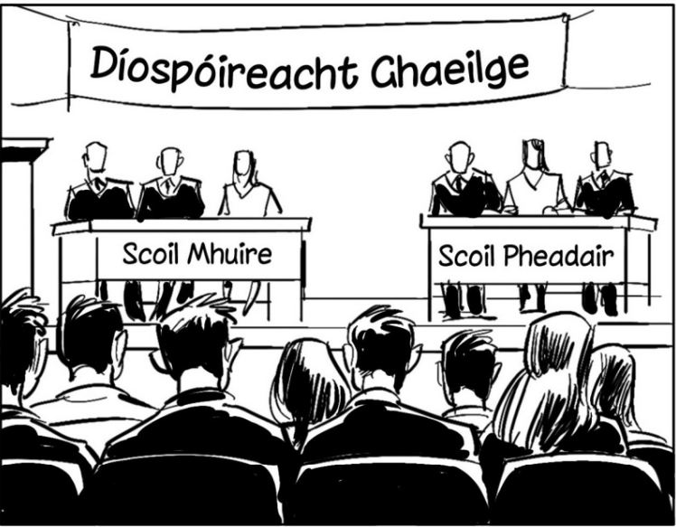 Bhí Scoil Mhuire (vwera) i gcoinne (against) Scoil Pheadair sa díospóireacht. Bhí Síle, Jack agus Colm ar fhoireann Scoil Pheadair. Bhí slua (crowd) mór ann.
