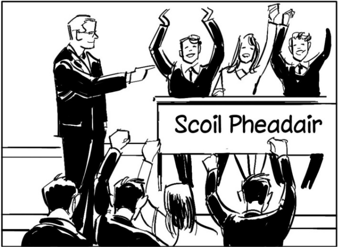 Chaith na moltóirí vóta (the judges cast their vote) agus rinne siad an cinneadh (decision) an bua a bhronnadh ar Scoil Pheadair. Bhí Síle, Jack agus Colm ar bís.